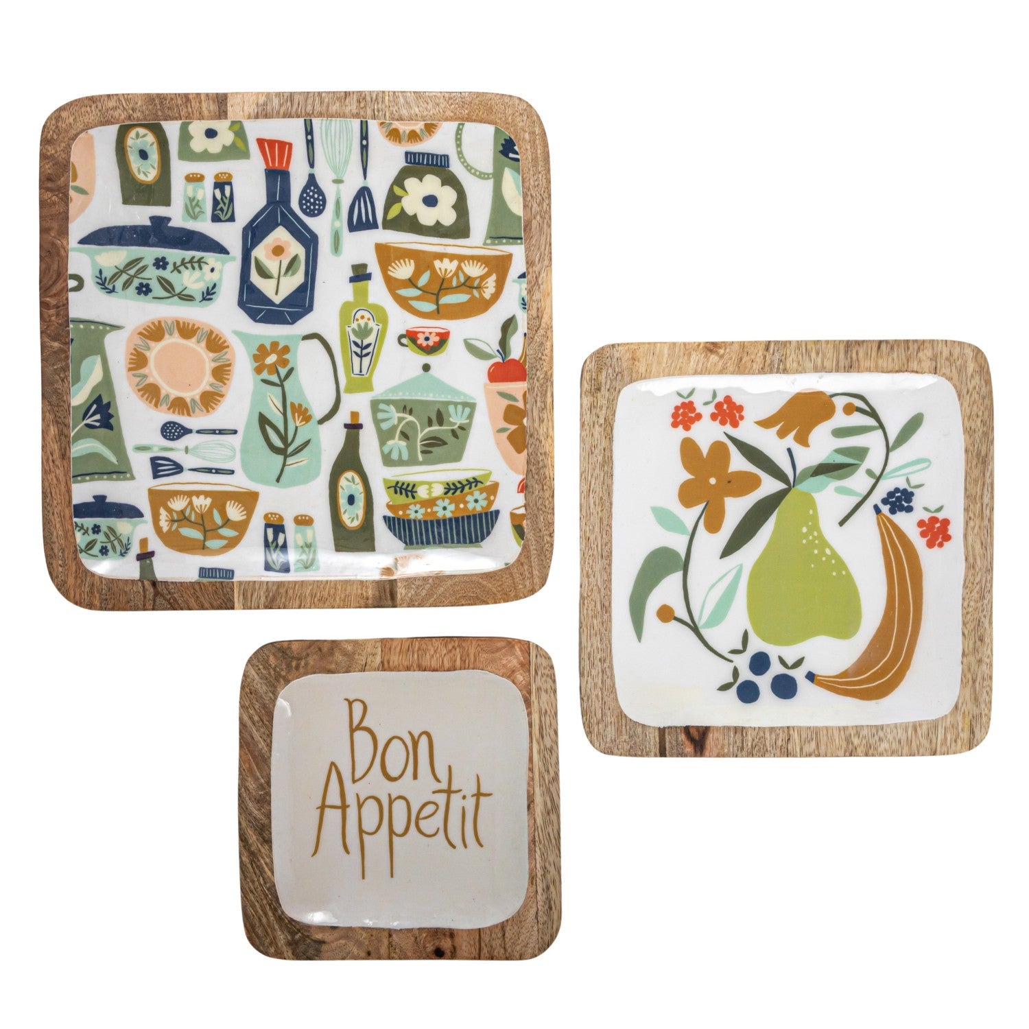 Enameled Mango Wood Trays w/ Kitchenware pattern, Set of 3