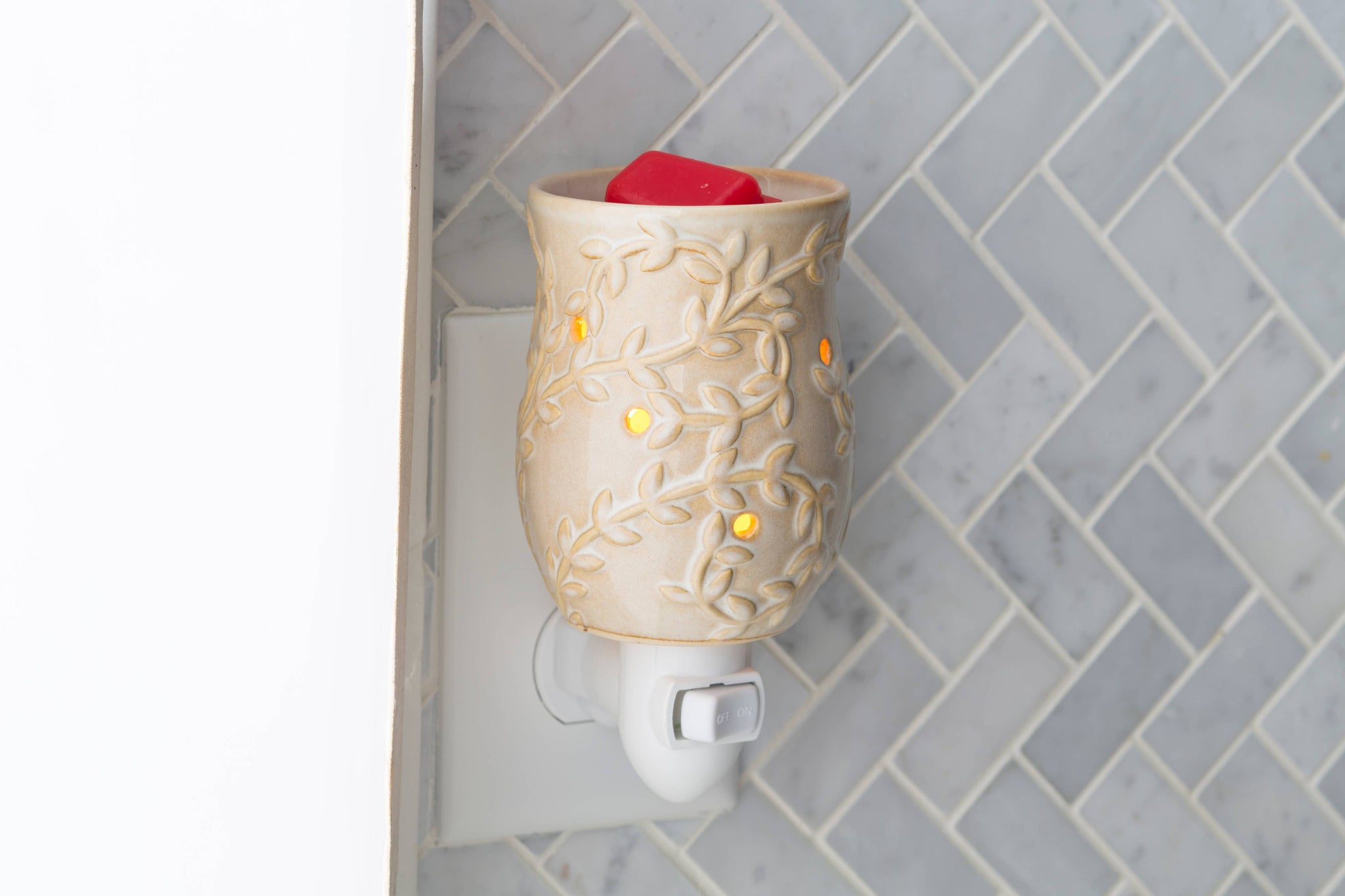 DESIGN: An ivory reactive glaze over a rich vine pattern, this pluggable warmer is a neutral accent in any small space. FUNCTION: Pluggable Fragrance Warmers can be used in both vertical and horizontal outlets by twisting the plug base, making them ideal for above counter outlets in small rooms and spaces.